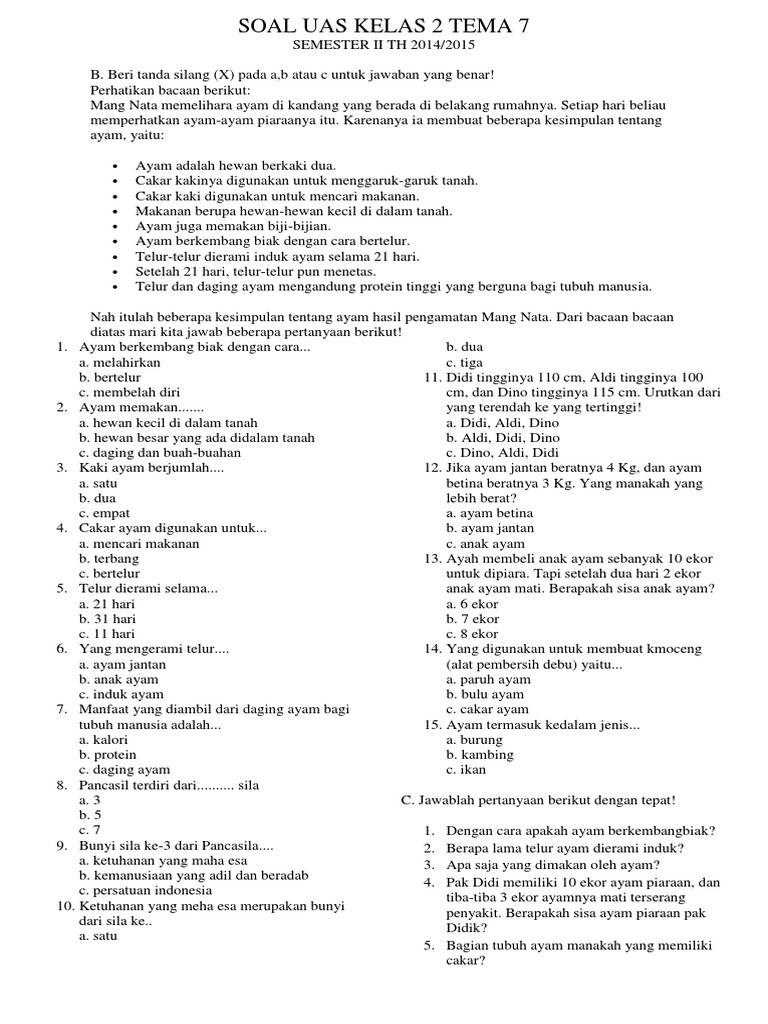 Dalam paket soal tematik ini, kami hanya bisa membagikan 25 soal pilihan ganda dan 10 soal isian. Bimbingan belajar brilian soal k13, soal kelas 2, soal tematik. Soal pas/pat sd semster 2 kelas 2 tema 7. Berilah tanda silang (x) pada huruf a, b atau c pada jawaban yang benar! Contoh soal pas k13 kelas 2 tema 7 merawat hewan dan tumbuhan.